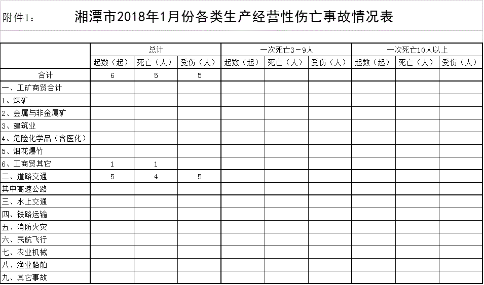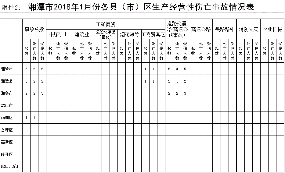 各县市区人民政府,市安委会各成员单位,有关企业: 现将2018年1月份全市生产经营性安全事故情况通报如下: 一、事故情况 1月份,全市发生各类生产经营性安全事故6起,死亡5人,受伤5人,直接经济损失约66万元,同比减少3起,少死亡1人,多受伤1人,分别下降33.3%、下降16.7%、上升25%。 (一)各行业事故分布情况 工矿商贸事故1起、死亡1人,同比减少1起,少死亡1人,其中:工商贸其他事故1起,死亡1人,同比增加1起,多死亡1人; 道路运输业事故5起,死亡4人、受伤5人,同比减少2起,多受伤1人,分别下降28.6%、上升25%,死亡人数同比持平。 (二)各地区(单位)事故分布情况 湘潭县事故3起、死亡2人、受伤2人,同比减少1起,少受伤1人,事故起数和受伤人数分别下降25%、33.3%,死亡人数同比持平。 湘乡市事故2起,死亡2人,受伤3人,同比增加1起,多死亡1人,多受伤3人。 雨湖区事故1起、死亡1人,均同比持平。 岳塘区事故0起,同比分别减少2起,少死亡1人,少受伤1人。 昭山示范区事故0起,同比分别减少1起,少死亡1人。 韶山市、高新区和经开区事故均为0起,均同比持平。 二、工作建议 一是深入贯彻近期会议及领导指示批示精神。各级各部门各单位要认真贯彻“1.25”国、省电视电话会议 和“1.19”全省安全生产“打非治违百日行动”动员视频会议精神,进一步提升政治站位,切实抓好岁末年初安全生产工作,确保春节和全国两会期间安全形势平稳。二是深入推进打非治违“春雷百日行动”。要深刻吸取有关事故教训,按照全市的统一部署,牢牢扭住“打非治违”这个牛鼻子,对非法违法行为铁腕整治,形成震慑。三是强化应急值守。春节将至,各级各部门要加强节假日应急值守,认真落实领导干部24小时带班值班,强化应急联动,备好应急物资,确保有效应对突发事故。 附件1:湘潭市2018年1月份各类生产经营性伤亡事故情况表 附件2:湘潭市2018年1月份各县(市)区生产经营性伤亡事故情况表 湘潭市安全生产委员会办公室 2018年2月6日